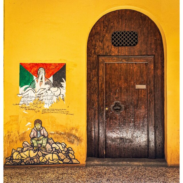 #freepalestine 🇵🇸 for #doorsday Written on the wall: "Every time I sleep in my house, there's a child who dies Every time I kiss my mother, another kisses a coffin Every time I close my door*, there's a house that gets bombed!" * Fixed by @kraks@pixelfed.de Also, above this I believe are lyrics to one of Bu Nasser's songs - but I unfortunately do not know Arabic! (Solved by Kraks again! Link to the song is in the comments!) ✨ #photography #amateurphotography #door #wall #olddoors #portico #urban #city #doorphotography #street #streetphotography #streetart #graffiti #urban #urbanarchitecture #bologna #cityscape #porta #portadì #italia #citta #art #europe