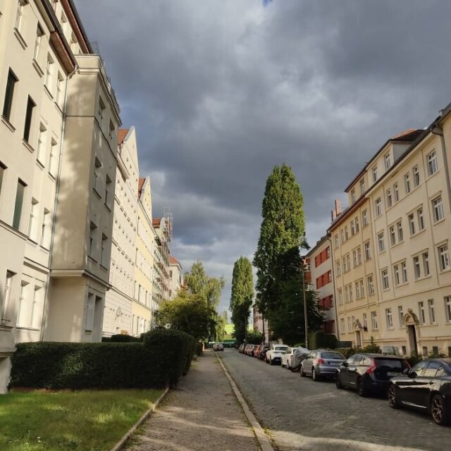Die Engelmannstraße in Leipzig-Sellerhausen, meiner Wohnstraße. Mein Haus ist rot-weiß mit Pappel. Anbei weitere Bilder im Kiez = rund um die Emmauskirche. Es lebe die Sonne, es leben die Wolken!