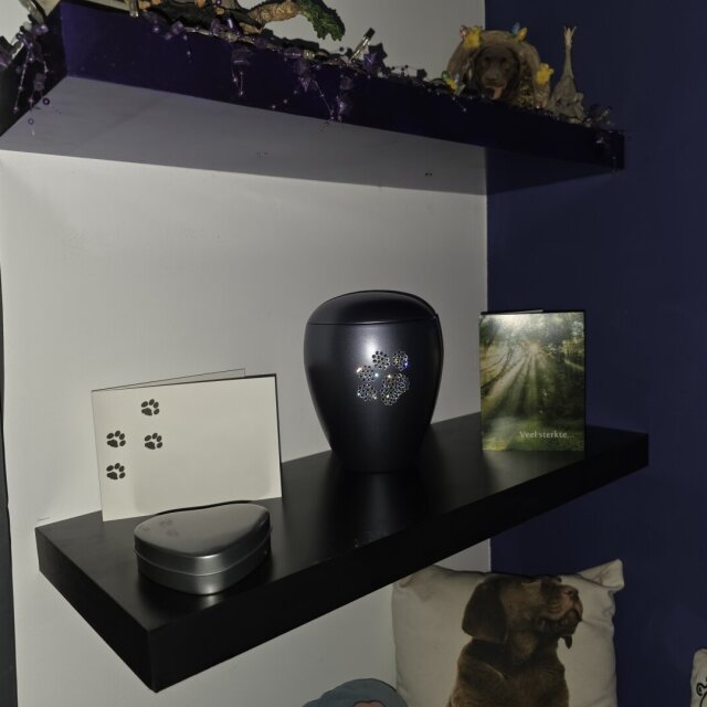 The shelf is mounted. Not in the place I hoped it could be, due to electric wiring in the wall. But it's up and now I need to await the acrylic frame. And figure out what I'll do with the paw prints.