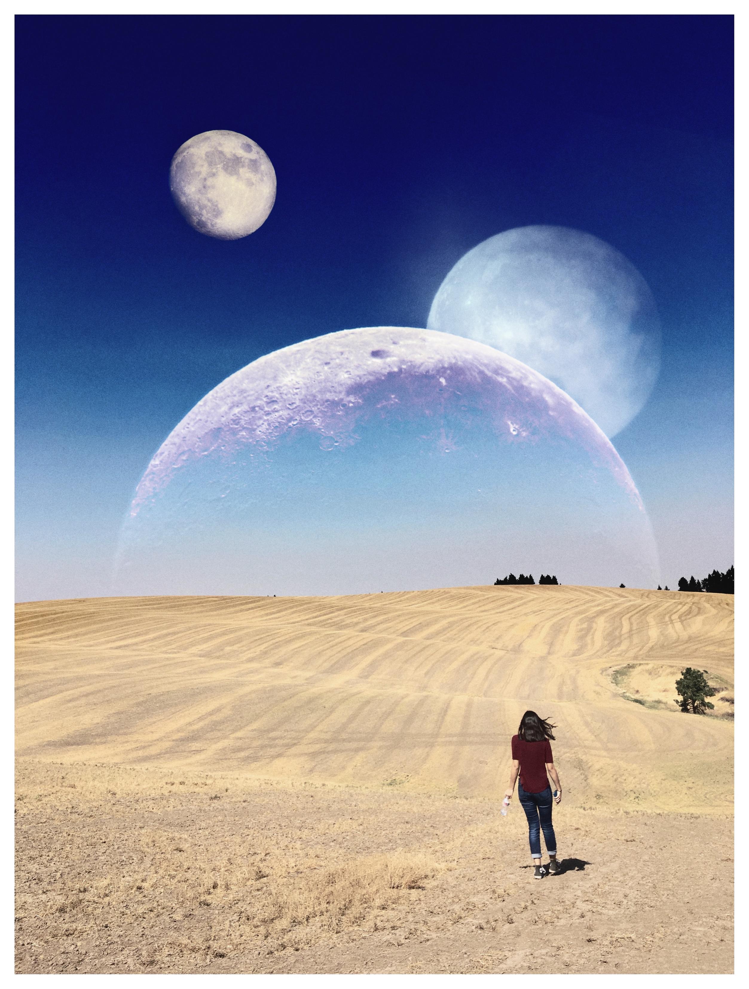 “Christina’s Worlds” (after Andrew Wyeth)Harvest complete, she leapt off the combine to survey the field. The three moons nearing Conjunction always took her breath away, a rare sight in the smog-choked metropoles. She’d earned enough from farm work for a starcab between moons, then a slow ship to the outer worlds. She’d ask Lia to come, but would go regardless of her answer. Stronger dreams were calling. #photography #photoart #doubleexposure #astrophotography #moon #landscape #microfiction