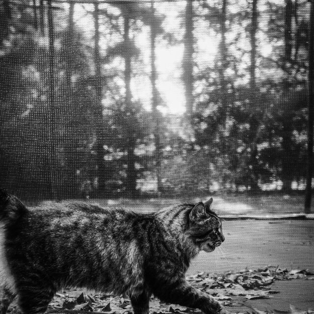 #caturday Shelby goes for a stroll on the side of our trampoline. Reminds me of the Beatles on abbey road. #photography #cat #catsofmastodon #catsofpixelfed #blackandwhite #bnw #monochrome