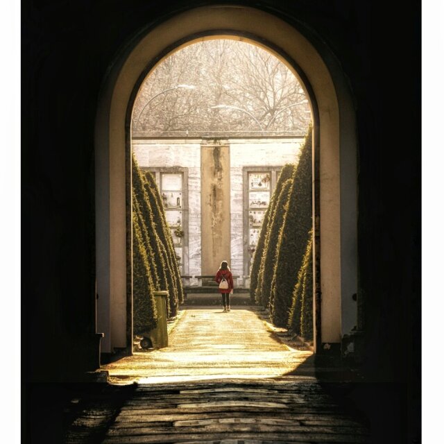 Through the Threshold for #doorsday (Repost! I just noticed that it was a little bit off centre and it began to drive me bananas 🫠🍌) From a quick trip to the local cemetery on Sunday! I'm so glad that this person didn't turn around because I was running to get the photo - I would have felt so bad if they had and there was a 6'2 curly cousin It just bolting in their direction. 😂✨ #photography #amateurphotography #archway #door #doorphotography #lacertosa #monumental #cemetary #sunlight #streetphotography #urban #urbanarchitecture #dark #moody #dreamy #dreamlike #cimitero #italia #italy #bologna