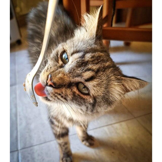 A-mew-se Bouche 😋 for #caturday Only the finest silver spoon treatment in this establishment. Got to make sure everything is up to standard for our VIP (Very Important Puddytat). 🫡✨ #photography #amateurphotography #pet #cats #cat #catsofmastodon #catsofpixelfed #petphotography #tabbycat #tabby #kitchen #hungry #portrait #gatto #sardinia #sardegna #puns #italy #italia #europe #micio