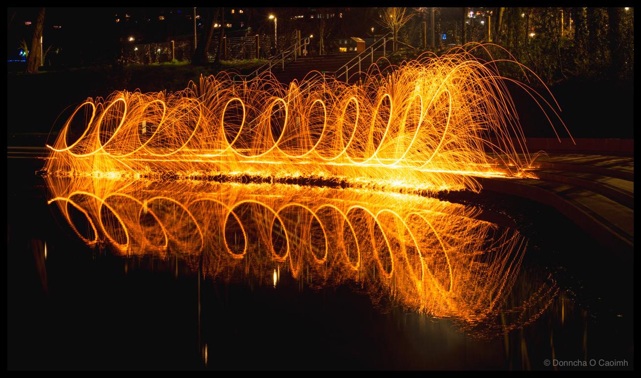 Playing With Fire Burning steel wool reflects in the still waters, tracing arc of fire through the air.... https://inphotos.org/2026/01/16/playing-with-fire/ #AtlanticPond #CreativePhotography #ExperimentalPhotography #FirePhotography #LightPainting #LongExposure #NightPhotography #ReflectionPhotography #SteelWoolPhotography