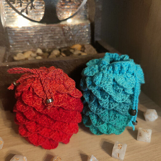 More Dragon Scale Dice Bags were made! These also feature recycled beads from old fashion jewelry for the drawstrings. I'm going for a Elemental Dragon theme. These are Fire and Water. (obviously... 😂 ) Yarn is Ricorumi Spin Spin DK. 🧶 #crochet #häkeln #crochetsky #dicebag #dnd #yarn #gamer #trinketbag