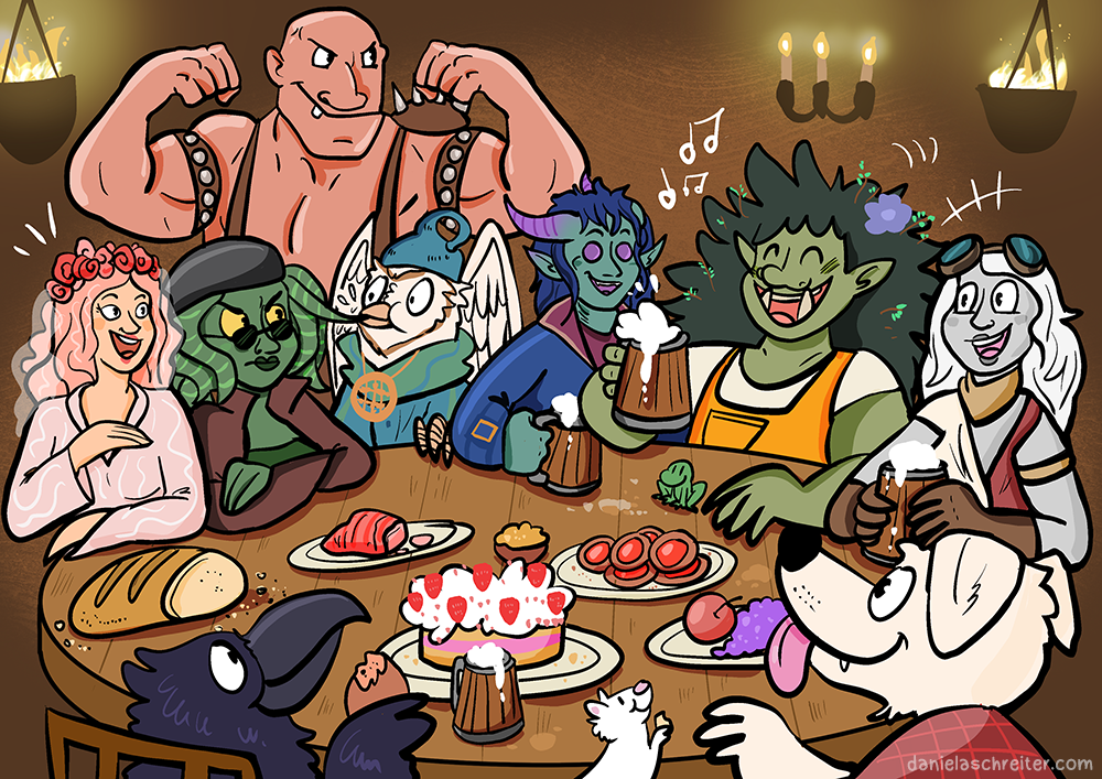 Letztes Jahr ging unsere DnD-Strixhaven-Kampagne bei @orkenspaltertv zu Ende und ich wollte unbedingt ein Abschlussbild zeichnen, wie wir alle in der Taverne feiern, aber immer kam etwas dazwischen. Jetzt hab ich es geschafft und ich erinner mich mit voller Freude an diese tolle Truppe 😄. Wir haben nun eine neue Kampagne namens "Wanderlust" angefangen, jeden zweiten Mittwoch im Monat gehts weiter und hier könnt ihr unsere Abenteuer als Playlist bei YT sehen: https://www.youtube.com/watch?v=1k2G2qTmrsA&list=PLjkM-KYfsyfPbSQbEs6qzDKxOEYm7yh2O#pnpde