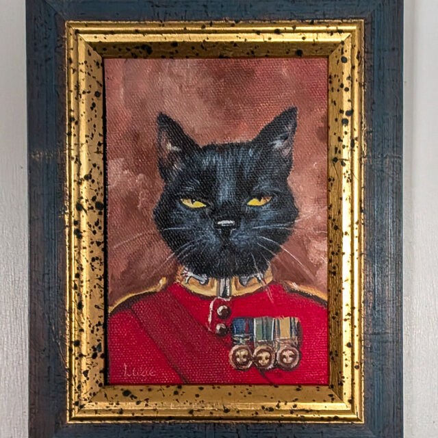 A custom #PetPortrait by Liese Chavez of my Hamish. He's wearing the classic red tunic of the Welsh Guards (denoted by the leeks on the collar) and has three service medals for dog noses scratched in the line of duty. He was a hell of a cat who ruled over our kingdom with wisdom and benevolence. He lived a good long life and I was lucky to have him in mine. I posted the original photo a while back (https://pixelfed.social/p/Jess.Stetson/932273744606752967) and I know I told someone about this portrait but I can't remember who so I can't tag them. Sorry whoever you are, my brain is mush. #Caturday #CatArt #cat #cats #gato #gatos #katze #katzen #BlackCat #GatoNegro #SchwarzeKatze #BlackCats #SchwarzeKatzen #CatsOfMastodon #CatsOfPixelfed #CatLovers