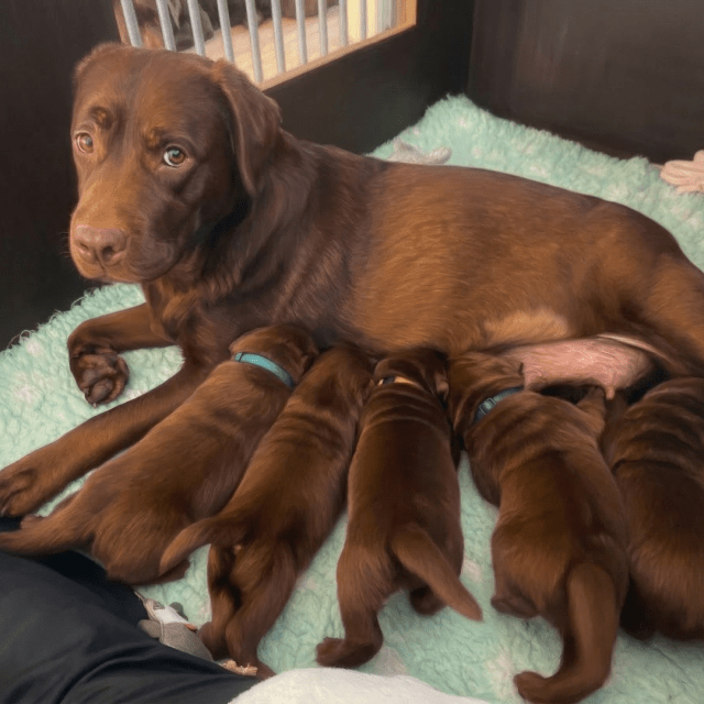 A luministic version of the picture. I could not add any text, so I'll share the alt text in this comment: A detailed luministic painting, edited by Nano Banana 2, based on a photo of a chocolate Labrador mother and her five nursing puppies. The mother dog lies on a mint-green blanket inside a whelping box, her brown fur reflecting the radiant, glowing light characteristic of the style. Five small puppies are lined up, suckling, with two wearing distinct collars (teal and blue). The background details, including the wooden frame and metal bars of the box, are rendered with a soft, ethereal quality. The foreground shows the edges of human clothing and a small toy, all unified by the smooth, atmospheric play of light and color that gives the scene a serene, idealized feel.