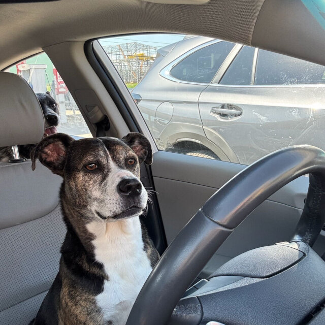 Athena learning to drive this afternoon while her brother makes faces from the back seat. #dogsoffedi #dogsofpixelfed #dogs #pets