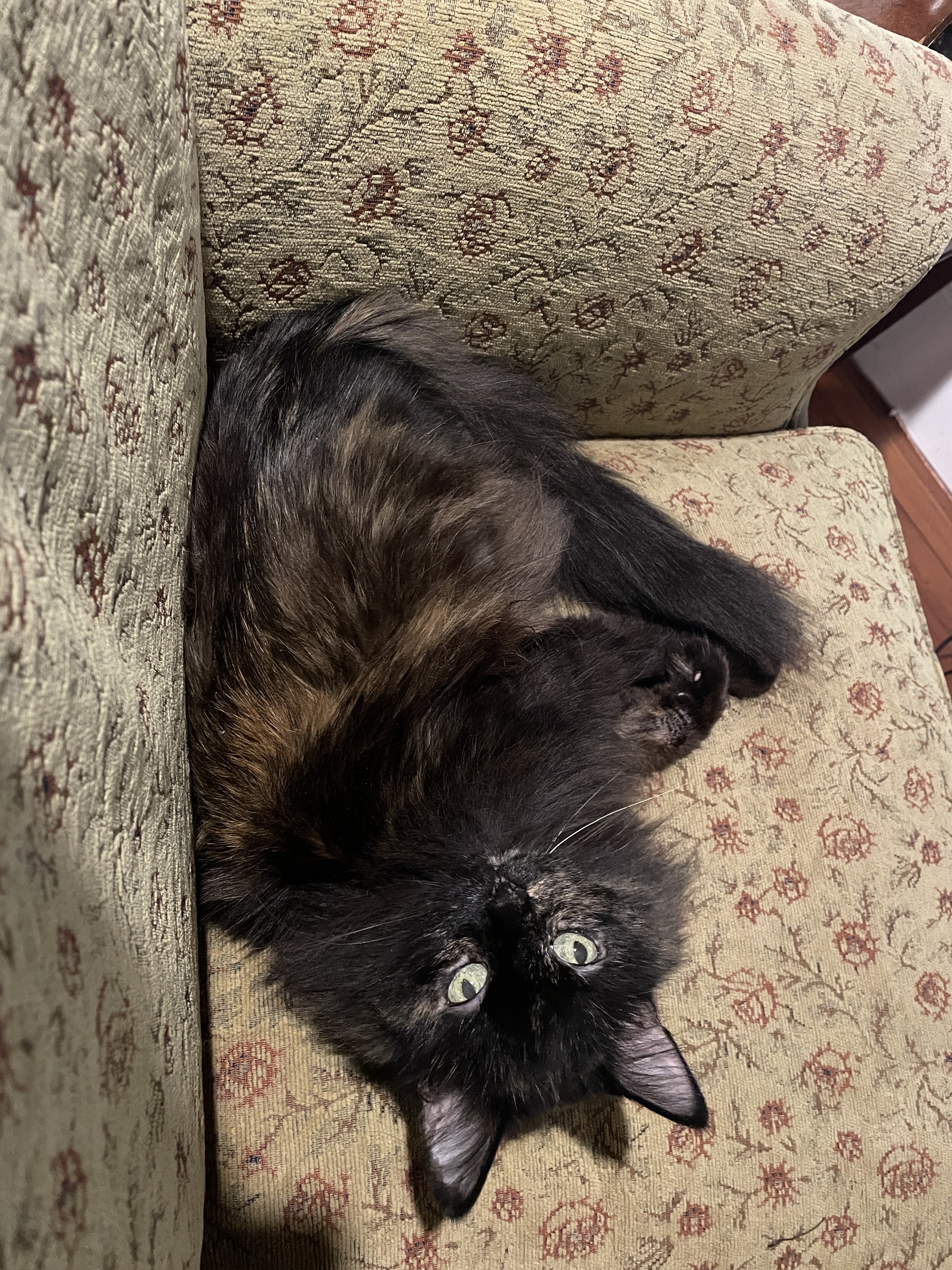 With apologies to LOTR, Pippin got her name from when she was a kitten she’d hang upside down, usually by resting on a chair with her belly up and her head hanging down the side of the cushion. She looked like a little bat. So we named her Pipistrelle, after a species of a very smol bat. That became Pippin. At 18 she doesn’t quite do the hanging upside down thing anymore but with camera angles we can still reproduce her batlike namesake. #Caturday