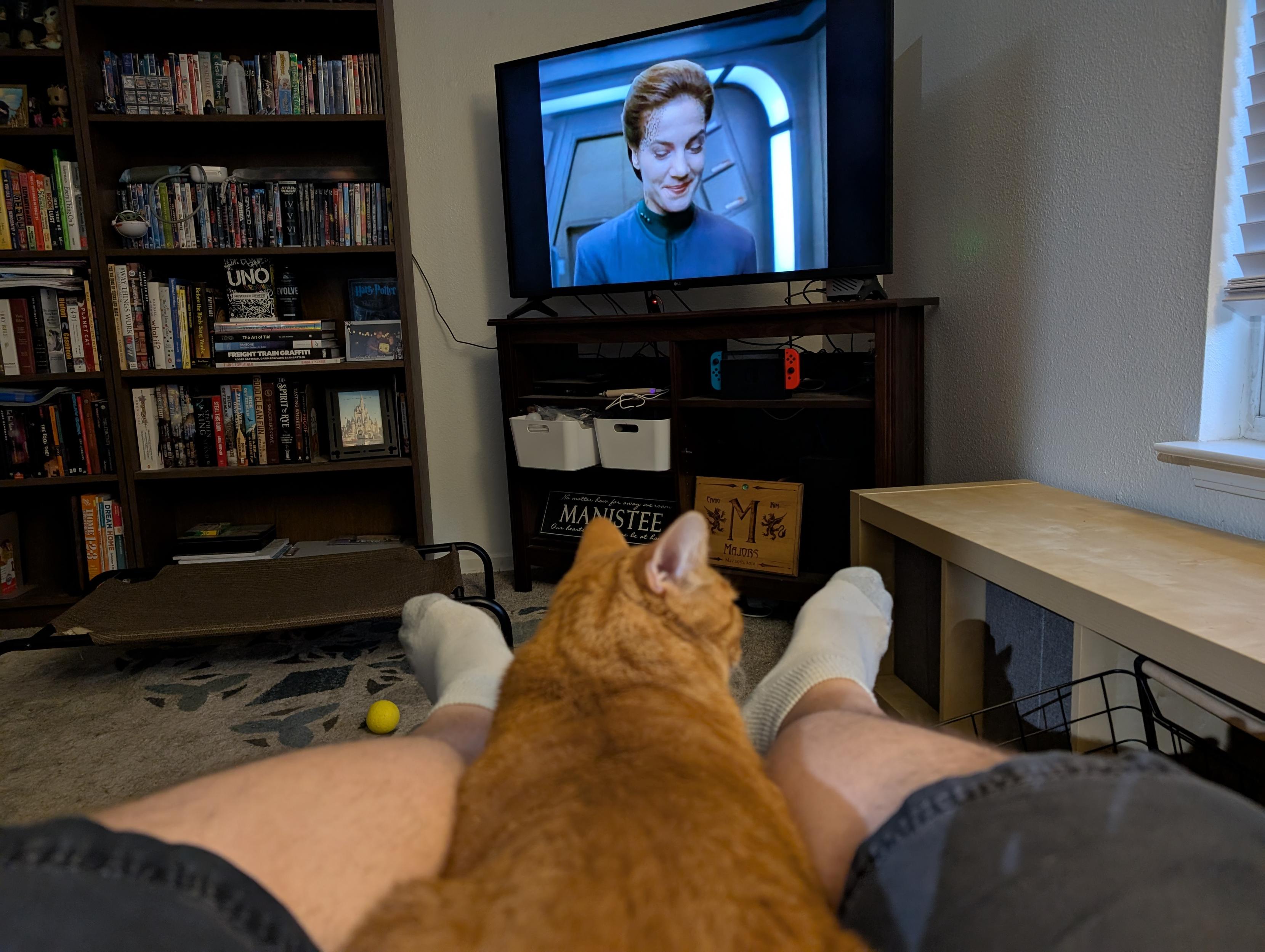Good Morning Mastodon! Obi was watching Deep Space Nine with me last night. #cats #CatsOMastodon #startrek #startrekds9
