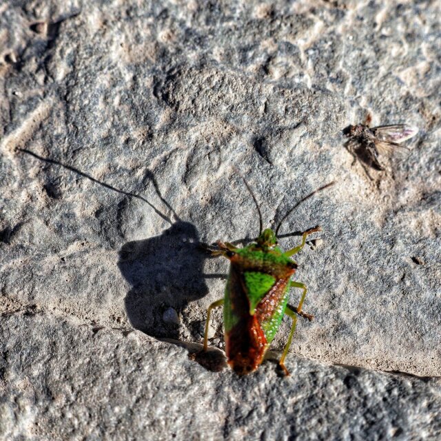 A #HawthornShieldBug (possibly) for #InsektenSamstag. Spotted this little show-off on the summit cairn (!) of #YrWyddfa/#Snowdon, where it nearly got trampled. 🤨 (Also, the sun was so bright so I didn't realize the focus is a bit off, sorry 🫣) #shieldBug #WipfelStachelwanze #Stachelwanze #Wipfelwanze #Wanze #stinkBug #AcanthosomaHaemorrhoidale #InsectSaturday