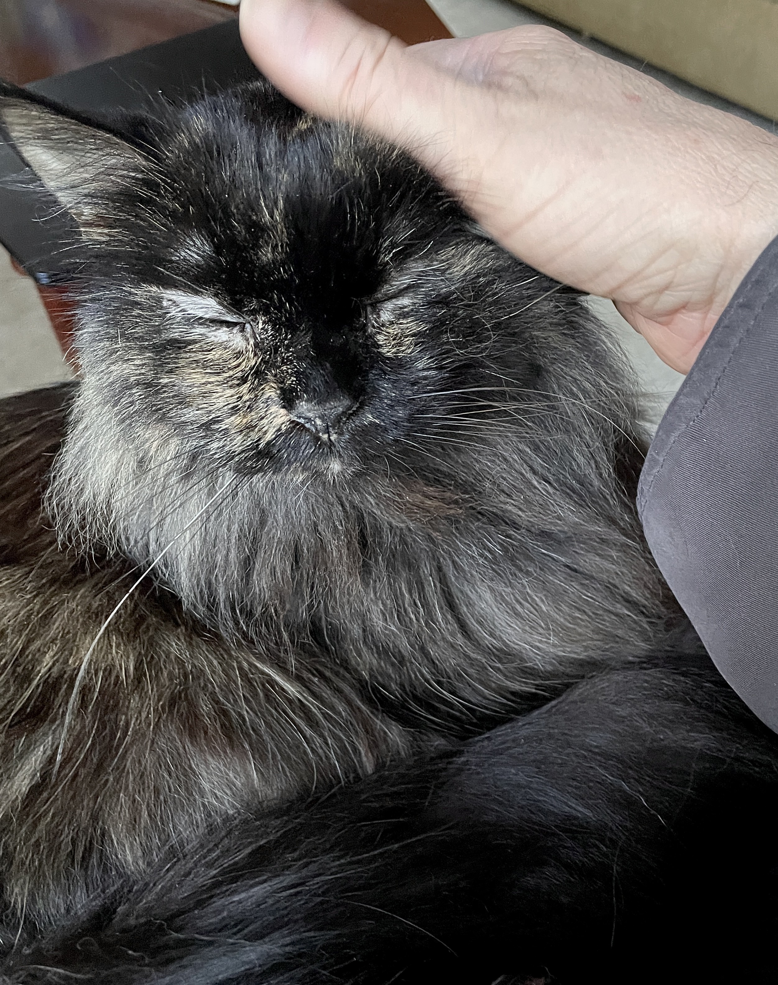 In her senior years the tortie colors have faded a bit and in the right light she has a gray mane. But… still a tortie. 🥹 #Caturday
