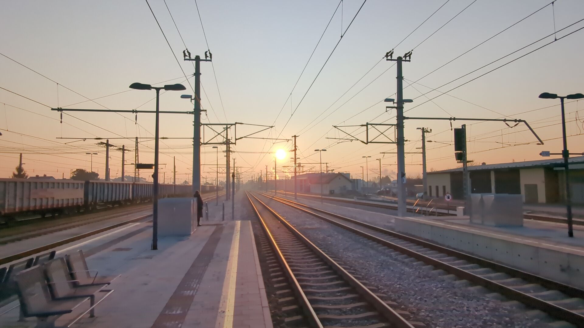 ẞSonnrnaufgsng über dem #Bahnhof #Tulln bei -12°C Da wirds kleine Fingerchen schon ganz schön kalt... wenns nicht im Handschuh steckt.❄️