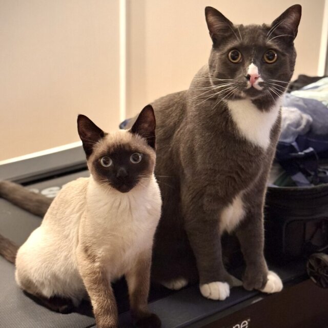 Happy #Caturday from these two adorable guys. Mister and Cappuccino waiting for bedtime treats. #cats #catsofpixelfed #brothers #polydactylcats #siamesecats #tuxedocat #petphotography #photography #pixelfed #fediverse #fedicats #catsofpixelfed