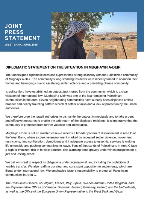 #Palestine / 12 countries condemn forced displacement of Palestinian village in West BankDiplomatic missions from #UK, #Germany, #France and 9 other nations issued joint statement expressing solidarity with residents of Mughayir a-Deir who were forced to abandon homes due to settler violence and Israeli authorities' failure to provide protection.As has been common practice for years, Israeli settlers established an outpost meters from a Palestinian village. The community was forced to flee after escalating violence and threats. Seven neighboring communities have already been displaced following the same pattern. Tens of thousands in Area C face "high or imminent risk" of forcible transfer.These countries demand Israel dismantle the outpost and allow safe return. They call this a violation of international law and demand Israel respect the prohibition on forcible transfer.https://xcancel.com/FranceJerusalem/status/1930155000791015483#m**JOINT PRESS STATEMENT****WEST BANK, JUNE 2025****DIPLOMATIC STATEMENT ON THE SITUATION IN MUGHAYIR A-DEIR**The undersigned diplomatic missions express their strong solidarity with the Palestinian community of Mughayir a-Deir. The community's long-standing residents were recently forced to abandon their homes and belongings due to escalating settler violence and a prevailing climate of impunity.Israeli settlers have established an outpost just metres from the community, which is a clear violation of international law. Mughayir a-Deir was one of the last remaining Palestinian communities in the area. Seven neighbouring communities have already been displaced amid a broader and deeply troubling pattern of violent settler attacks and a lack of protection by the Israeli authorities.We therefore urge the Israeli authorities to dismantle the outpost immediately and to take urgent and effective measures to enable the safe return of the displaced residents. It is imperative that the community is protected from further violence and intimidation.Mughayir a-Deir is not an isolated case—it reflects a broader pattern of displacement in Area C of the West Bank, where a coercive environment marked by repeated settler violence, movement restrictions, land confiscation, demolitions and inadequate access to essential services is making life unbearable and pushing communities to leave. Tens of thousands of Palestinians in Area C face a high or imminent risk of forcible transfer. This alarming trend gravely undermines prospects for a just and lasting peace.We call on Israel to respect its obligations under international law, including the prohibition of forcible transfer. We also reaffirm our clear and consistent opposition to settlements, which are illegal under international law. We emphasise Israel's responsibility to protect all Palestinian communities in Area C.*The Consulates General of Belgium, France, Italy, Spain, Sweden and the United Kingdom, the Representative Offices of Canada, Denmark, Finland, Germany, Ireland, and the Netherlands, as well as the Office of the European Union Representative to the West Bank and Gaza*@palestine @israel #SettlerViolence #IsraelWarCrimes #Palestine #EthnicCleansing #GazaGenoicide