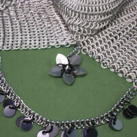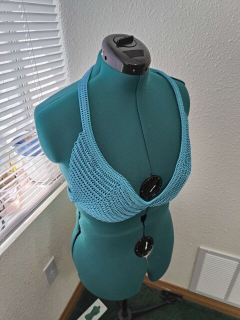 This is a chainmail bra made from half anodized aluminum rings and half rubber rings. Both kinds of rings are a brilliant sky blue. The rubber rings provide some stretch and insulation, making it more comfortable to wear than a bra made from all metal. There is only one clasp around the back, and the straps around the neck are fixed. #chainmail #chainmaille #armor #maker #crafts #costume #fashion
