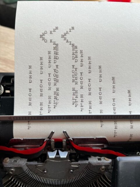 ’Need your help’ - 2025. Even-though the message of this work is quite intense, there is something about the form that I find mesmerising. It is almost as if you are entering a cave or going through a tunnel. #art #oc #arte #vispo #poem #design #artist #artwork #abstract #writing #typewriter