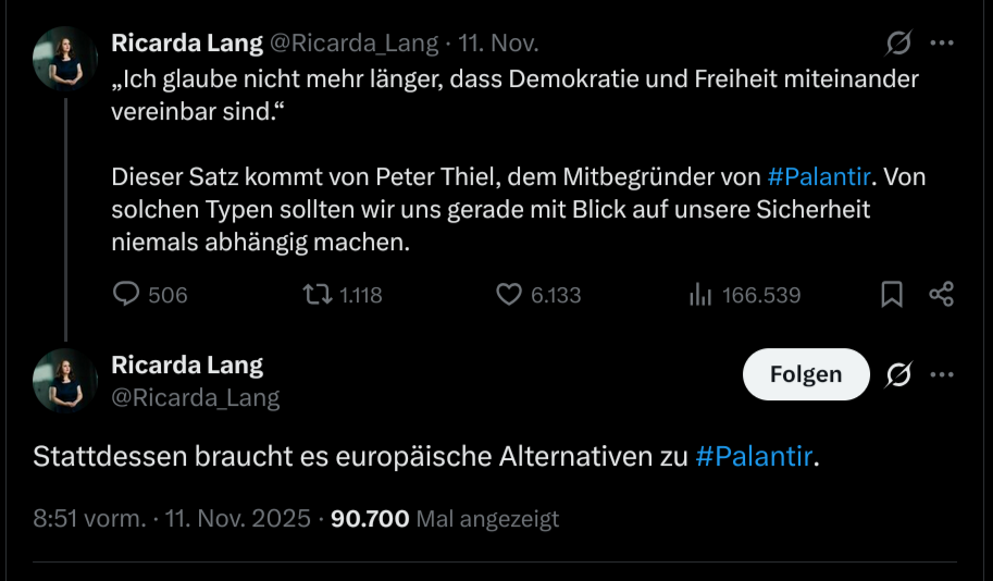 Und warum glaubt die #Grüne Lang, dass wir eine EU-Alternative zu Palantir brauchen, eine System zur #Massenüberwachung?