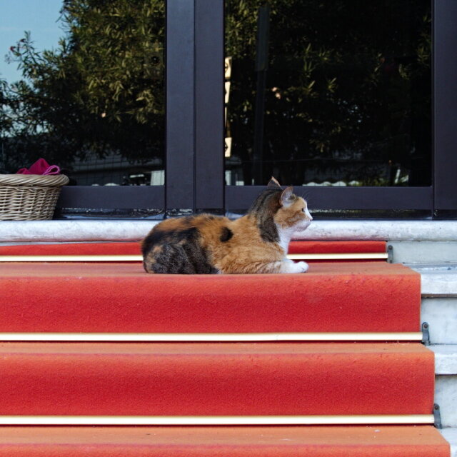 Non so, io l'ho visto lì circa 2 settimane fa, ma penso sia probabile che bazzichi in quel giardino un po' sempre, però più in veste di ospite che gradisce qualche scarto o qualche topino, che come guardiano, poi mi sembra difficile che quando l'hotel è aperto lo lascino stare lì in cima alla scala, però nemmeno impossibile.