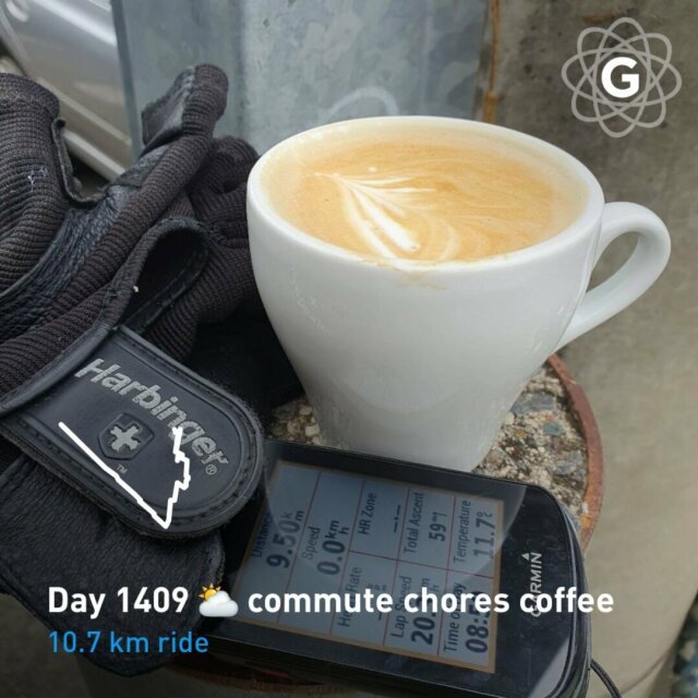 ajft Day 1409 ⛅ commute chores coffee Daily #cycling photos; a visit to the hammerbarn on #mycommute, then a very enjoyable #coffeeneuring flat white on the way to work