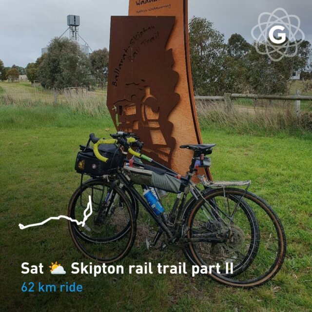 ajft Sat ⛅ Skipton rail trail part II Three day #cycling trip along the Ballarat-Skipton #railtrail, day two - Snake valley to Linton to Skipton then back. A bit wet and soft, some #magpies swooping, great #pub accommodation and food