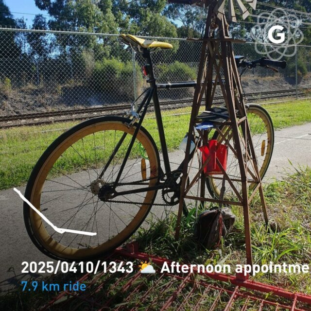 ajft 2025/0410/1343 ⛅ Afternoon appointment Off to an appointment on the #fixie, then found an odd trail-side #sculpture ... or junk ... while #cycling home #laterfed