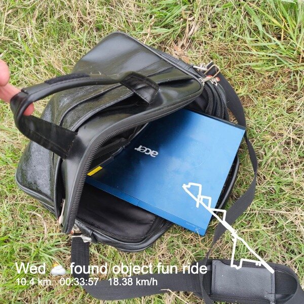 ajft 2026/0304/1553 ⛅ found object fun ride Out for the daily #cycling break to the next suburb and back. Oh look, there's a fairly newish laptop bag lying in the grass yeeted over by the railway fence. What's that skip? There's a laptop in it. Surprise surprise. There was eye-rolling in the house as I returned with yet another #roadsidefind #BikeTooter