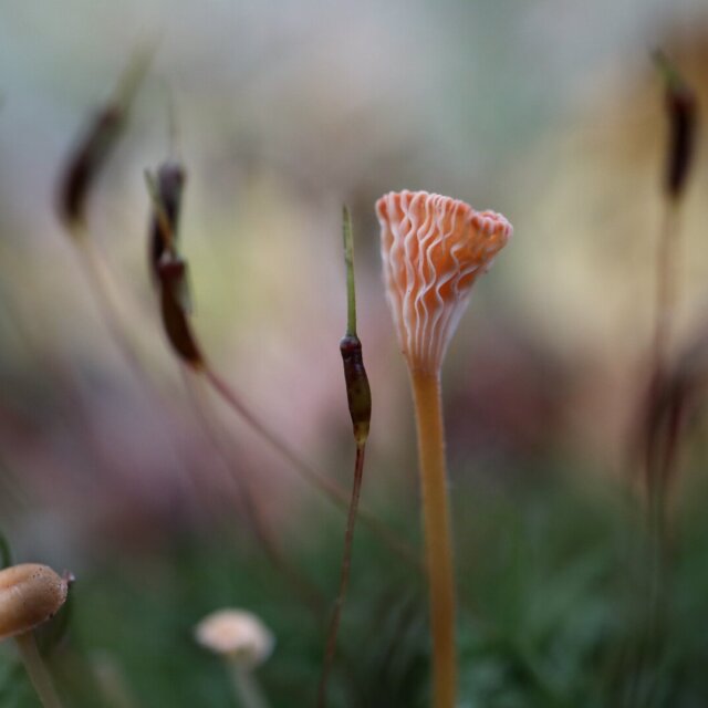 Microworld in the moss. Among the moss, a small mushroom, fragile and translucent, rises like a natural sculpture. It reveals the beauty hidden in the corners of the forest. In this silent and hidden microworld, each shape and tone breathes with its own rhythm. #MacroPhotography #Nature #Microworlds #Mosses #Forests #Autumn #MushroomKingdom