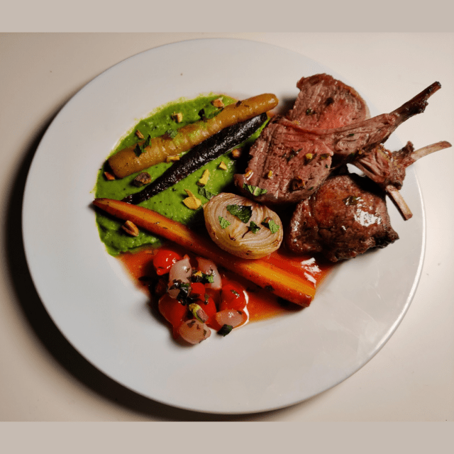 Rack of lamb, roasted carrots and onions, mint and peas puree, grapefruit jus with pickled mini peppers and pearl onions, toasted pistachios with thyme.