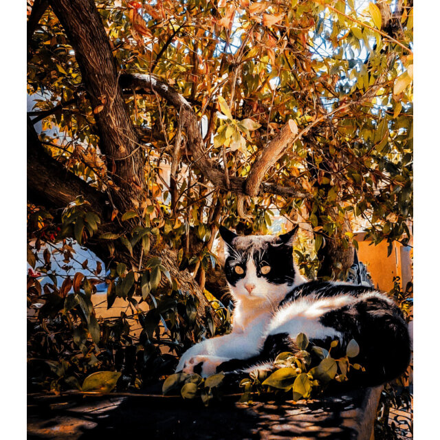 Tree Hugger 🌳 for #caturday #photography #amateurphotography #pet #cats #cat #catsofmastodon #catsofpixelfed #petphotography #shadows #portrait #gatto #eyes #autumn #autumncolours #trees #europe #micio #cute #tuxedo #tuxedocat #blackandwhitecat #shorthair #whiskers #sardegna #sardinia #italy #italia