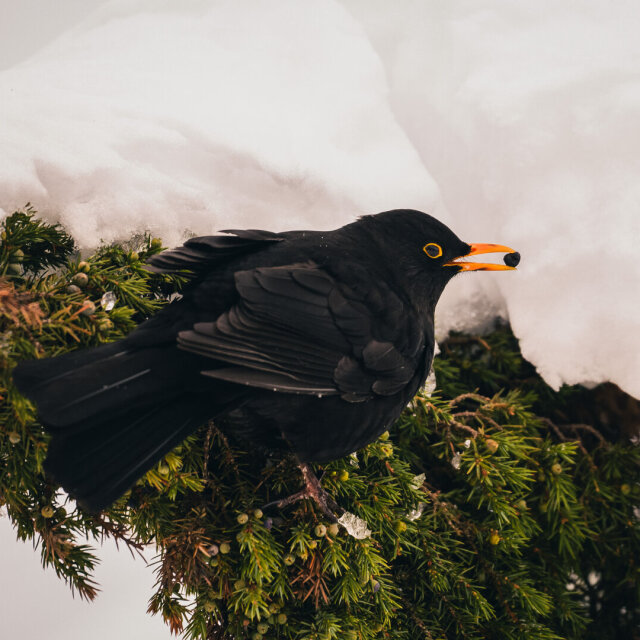 What a lovely shot of blackbird! I like how his head is in front of the snow, it makes up a very nice composition with focus on the beak and berry :]