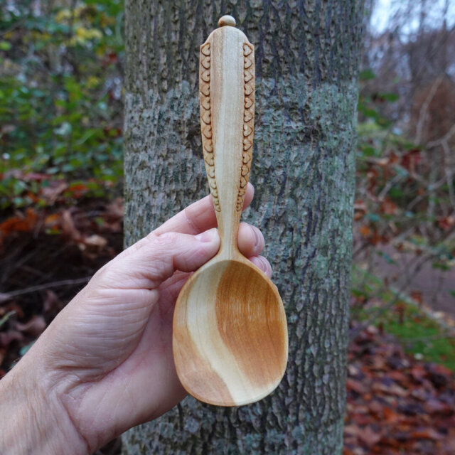 Porridge spoon with decorations, carved from cherry wood. The first porridge spoon in this Sunday series of six spoons posted with porridge rhymes quoted from my Swedish porridge bowl that I think is from the 1920s. This Sunday my Swedish porridge bowl reads: Det är i sin ordning Att jag såsom skåning Med gröt skall fylla min mellersta våning! (English translation is very difficult) #craft #crafts #woodcarving #greenwoodcarving #spooncarving #woodenspoon #eatingspoon #porridgespoon #cherry #slöjd #sloyd #handmade #handcraft #sustainability