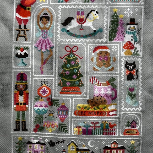 My last finish for 2025. “Ho Ho Holiday” SAL from The Tiny Modernist. Fabric is a 16 ct Aida “Twilight Blue”. Floss is DMC. This was such a fun and festive item to stitch. #CrossStitch #TinyModernist