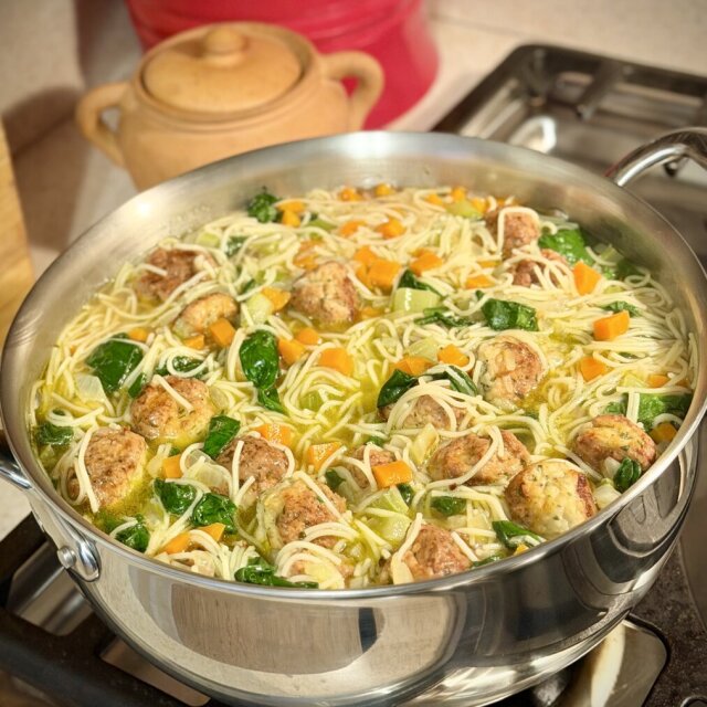 Soup season. A riff on Italian wedding soup: — basic sofrito of carrots, celery, and onion, — chicken broth, — spinach, — noodles, cooked separately, then added, — chicken meatballs, roasted in the oven, then added, — parsley and dill, dill, dill. It seems better to prepare noodles and meatballs separately rather than in the soup so they won’t absorb too much liquid. I can have this every day. #food #cooking #soupseason #chickensoup #noodles #cookingathome #inmykitchen