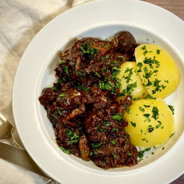 I’ve never made Julia Child’s beef bourguignon and I’ve always wanted to make Julia Child’s beef bourguignon. And now I think I will never make Julia Child’s beef bourguignon. It was a perfect day for a long slow cooking venture. Day off from work. Cold and snow outside. Nagging to-do list was more or less completed. All the ingredients were on hand. But some of the directions in the recipe were dragging me down. And some of the ingredients — like pearl onions. And then Ruth Reichl’s newsletter dropped in. It contained a couple of suggestions to see us through the stormy weather. Beef, Wine, Onion stew was one of them. The description — it was not a recipe — was a definite variation on the famous beef bourguignon but so liberating. No timing, no quantities — just a splash, a squirt, a pat, and as many as you feel like. And whatever. And no pearl onions. I jotted down the plan on a sticky note and put a movie on my iPad. Here’s what was on my note (sans the stuff in brackets): STEP 1 — TO BROWN — pat of butter — lots of onions (I had 5 large ones) — good bacon, lardons (there was a 7 oz chunk) — carrots (I had 3) — lots of garlic (I used 10 cloves) — thyme (huge 5-finger pinch of dried) — squirt of tomato paste at the end STEP 2 — TO BROWN — oil & butter — beef: salt, pepper, flour (I had 3,5 lb chuck, 2”-cubed) — deglaze with brandy STEP 3 — 300°F, 3 HOURS — good red wine (whole bottle) — celery stalk — bay leaf STEP 4 — brown mushrooms in butter, mix in at the end (2,5 lb, quartered) — boil potatoes to serve — parsley to garnish Amazing, amazing, amazing result! For the movie — HBO put Mad Men back on. I’ve never seen it but read about it and wanted to give it a shot. Honestly, it watches like horror series. #food #cooking #beefstew #beefbourguignon #inmykitchen #stormyweatherdinner #myhappyplace
