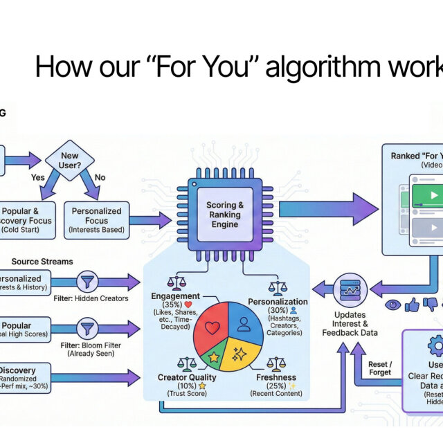 @hipsterelectron@circumstances.run We updated the alt text with a better description: How the Loops For You Algorithm works, it visualizes how the platform selects videos for users when using the For You feed. It shows a flowchart starting from a user request, branching based on whether the user is new (receiving a "Popular & Discovery Focus") or returning (receiving a "Personalized Focus"). Three content sources—Personalized, Popular, and Discovery streams—are filtered for hidden creators or already-seen content and fed into a central Scoring & Ranking Engine chip icon. Below this engine, a pie chart details the scoring weights: Engagement (35%), Personalization (30%), Freshness (25%), and Creator Quality (10%). The engine outputs the final "Ranked 'For You' Feed." A feedback loop shows user actions updating interest data for future recommendations. A prominent section in the bottom right emphasizes User Control with a trash can icon, stating users can "Clear Recommendation Data at Any Time (Resets Interests & Hidden Creators).
