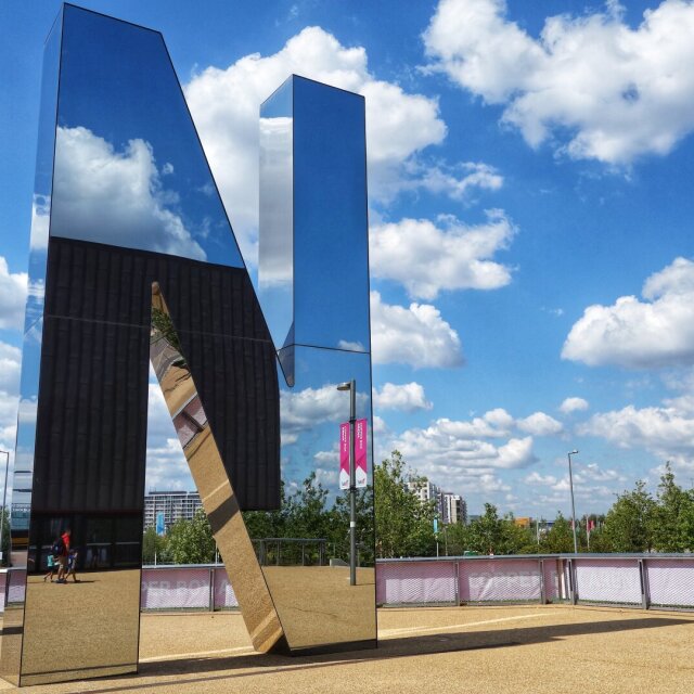 #FotoVorschlag: Dinge die mit "N" beginnen oder so aussehen // Things that start with "N" or resemble the letter "N" Ein formschönes N im #OlympicPark #London (ja, es ist gespiegelt; ich hatte ursprünglich die Rückseite aufgenommen, aber ein И ist ja was ganz anderes). Es gehört zur #Skulptur "RUN". // A striking N at #QueenElizabethOlympicPark in London (yep, I flipped it; I photographed it from behind, but an И is an entirely different matter). It's part of the #sculpture "RUN". 𝘙𝘜𝘕 𝘪𝘴 𝘢 𝘨𝘭𝘢𝘴𝘴 𝘢𝘯𝘥 𝘴𝘵𝘢𝘪𝘯𝘭𝘦𝘴𝘴 𝘴𝘵𝘦𝘦𝘭 𝘢𝘳𝘵𝘸𝘰𝘳𝘬 𝘮𝘢𝘥𝘦 𝘶𝘱 𝘰𝘧 𝘵𝘩𝘳𝘦𝘦 𝘩𝘶𝘨𝘦 𝘭𝘦𝘵𝘵𝘦𝘳𝘴 𝘣𝘺 𝘢𝘳𝘵𝘪𝘴𝘵 𝘔𝘰𝘯𝘪𝘤𝘢 𝘉𝘰𝘯𝘷𝘪𝘤𝘪𝘯𝘪, 𝘦𝘢𝘤𝘩 𝘯𝘪𝘯𝘦 𝘮𝘦𝘵𝘳𝘦𝘴 𝘩𝘪𝘨𝘩. 𝘐𝘵 𝘪𝘴 𝘢 𝘣𝘰𝘭𝘥 𝘢𝘳𝘤𝘩𝘪𝘵𝘦𝘤𝘵𝘶𝘳𝘢𝘭 𝘴𝘵𝘢𝘵𝘦𝘮𝘦𝘯𝘵 𝘰𝘯 𝘰𝘯𝘦 𝘰𝘧 𝘵𝘩𝘦 𝘩𝘪𝘨𝘩𝘦𝘴𝘵 𝘱𝘰𝘪𝘯𝘵𝘴 𝘰𝘧 𝘵𝘩𝘦 𝘗𝘢𝘳𝘬. (https://www.queenelizabetholympicpark.co.uk/explore-park/see-and-do/art-park) #blueSky #blueSkies #blauerHimmel #mirror #mirrored #Spiegelung #MonicaBonvicini #art #artInstallation #publicArt #Kunst #Kunstinstallation #öffentlicheKunst #OlympicParkLondon #LondonPhotography #CopperBoxArena #Stratford