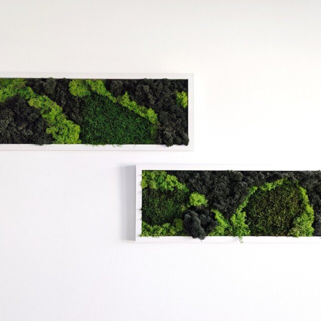 #FotoVorschlag: Objekte, die mit "M" beginnen oder so aussehen // Objects beginning with "M" or resembling it #Moosbilder, selbstgemacht. Bei dem großen #Moosbild in der Essecke hab ich mich als ahnungslose und talentfreie DYI-Anfängerin bei der Menge an konserviertem #Moos total verschätzt. Weil noch so viel übrig war, habe ich fürs Schlafzimmer auch noch zwei Bilder gemacht. // #Moss art, self-made. I made a large #mossWall piece for the space above the dining table, but being a clueless #DYI noob, I ordered far too much preserved moss. So, I ended up making two more moss wall panels for the bedroom. + MinimalismMonday #TextureTuesday #mossy #mosstodon #mossArt #Mooskunst #minimalistic #minimalism #minimalistisch #Minimalismus #minimal #minimalist #basteln #artsAndCrafts
