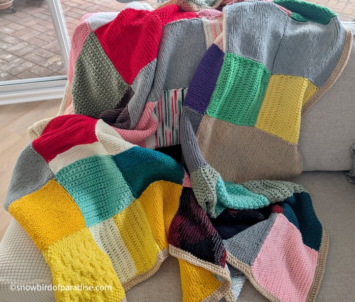 Silver Adventures BlanketOne of my hobbies involves making blankets out of miscellaneous balls of yarn. Sometimes it is leftover yarn I have sitting in my crafting cupboard, sometimes it is yarn I find at thrift stores, and sometimes it is yarn donated to the local volunteer centre. The volunteer centre has a group called Angel Crafters who make knitted or crocheted squares and this group has been so successful that there are now too many squares and not enough people to put them together. Last year I volunteered to put some squares together and produced a few blankets that were subsequently donated to people living in local shelters.A few months ago I dropped by with some crocheted squares and, when I was told they could not take any more squares, I offered once again to turn them into blankets. This conversation was overheard by the woman who leads the Silver Adventures Cafe which is a group of seniors who meet monthly to learn something new. She asked me if I would lead a workshop teaching the group how to join the squares to make blankets and I happily agreed.In the following weeks I prepared a PowerPoint presentation complete with links to useful YouTube videos, some pictures of my completed blankets, and a step-by-step approach from layout to completion using either a needle or a crochet hook. It would have been great, but unfortunately the venue’s technology did not have the necessary cable to link to my laptop. So, I winged it without the PowerPoint.Fortunately, I had prepared a handout that included the video links I had intended to use and we were able to show them via a different computer. After that, it was a matter of reading the room and trying to accommodate a wide variety of skill sets. Some of the attendees were experienced in knitting or crocheting, and some had never held a crochet hook. I began by showing the group how to make a slip knot, and was surprised when one person told me she had never learned that before.After the workshop was over, some of the Silver Adventurers volunteered to make blankets and took bags of squares home with them, so I consider that a success. I took home the squares that the group had joined during the workshop and since then I have been working on them to put together a blanket. Given that the participants abilities varied considerably, I am pleased that the end product turned out as well as it did. When Angel Crafters and Silver Adventurers get together, they can make a really cosy comforter for someone who just needs to feel warm.#AngelCrafters #blankets #crafting #crafts #crochet #crochetPattern #hobbies #knitting #seniors #SilverAdventures #volunteers #yarn