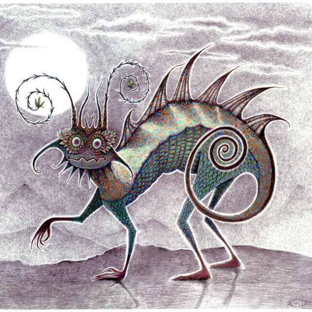 MIDNIGHT MONSTERS: A Startled Moontinkifer Do not be afraid. Like many night creatures, they just wish to be left alone. These secretive beings often hide in the shadows, except when the moon is full and bright. The midnight moon is their time of wonder and if you happen to be in the right place at the right time, you just may witness some magical happenings. This particular midnight monster is called Moontinkifer and can be found high up in the Balkan mountain range on the border between Bulgaria and eastern Serbia . It was not easy getting to this destination, but I have found it worth the effort, expense and skinned knees. Legend says that if one is lucky enough to spot them during the day, they appear as drab, colorless creatures, almost invisible against the mountain landscape of rocks and boulders. They shine (literally) at night when they come out of their hiding places to dance. Moonlight causes a shimmering transformation from dull gray to a luminous rainbow colored glow! It is believed that the glimmer of incandescent color and magical movements is their way of attracting a mate. Otherwise, they appear to be quite shy, non-aggressive individuals, who unfortunately, startle easily. This artwork is NOW AVAILABLE in my Redbubble shop: https://www.redbubble.com/people/gretchenkdeahl/shop (Redbubble fulfills and ships orders worldwide. :-) (100% human-made) human imagined, drawn and painted, no AI whatsoever. #art #artist #illustration #illustrator #spiritual #drawing #paintings #noAI #childrensbooks #fineart #artwork #landscape #nature #childrensart #artforchildren #interiordecor #flowers #mastoart #art #artistsonmastodon #artlover #artlovers #decor #popart #artnet #artlover #artlovers #handmade #supportthearts #monsters #monster #creature #friend #love #moon #moonlight #de_artists #mastoart #de_artist #artist_de #mastoart #mastoartist #de_artists