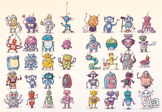 Für die Rätselseite einer Kinderzeitschrift hatte ich neulich 40 Roboter gezeichnet. Recently I illustrated 40 robots für a puzzle in a children's magazine. -- #Illustration #Roboter #Robot