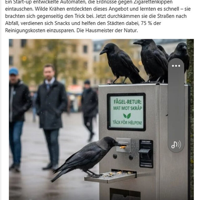 Crows are intelligent birds and learn quickly – even from each other. In Sweden, they are used to collect cigarette butts and bring them to a machine that automatically rewards them with peanuts. Here some links provides by users: https://journals.sagepub.com/doi/10.1177/25166042241296275 and: https://www.heise.de/news/Schwedisches-Start-up-hinter-Kippenstummel-sammelnden-Kraehen-meldet-Insolvenz-an-11094091.html
