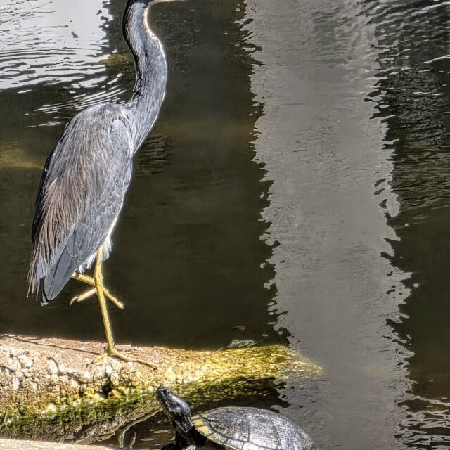 :goose_honk: much to discuss on #WildlifeWednesday 📍 tricolored heron (Egretta tricolor) & yellow-bellied slider (Trachemys scripta scripta), Sunbeam neighborhood, Jacksonville, Florida